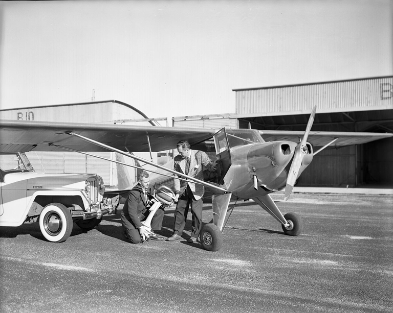 Men loading Evinrude motor onto airplane; Jeepster in background